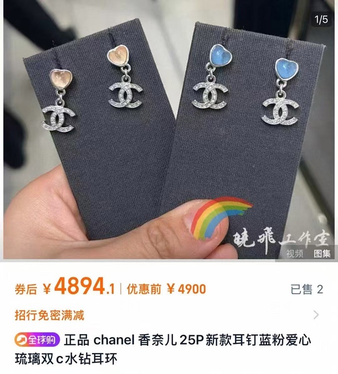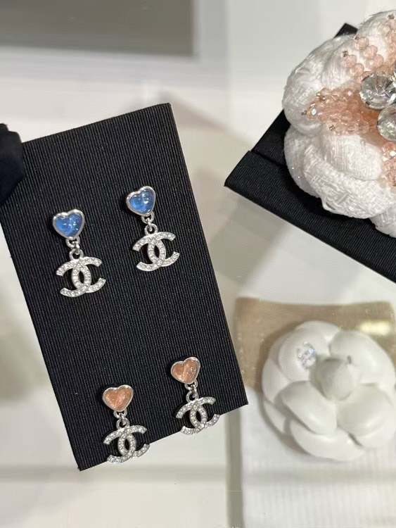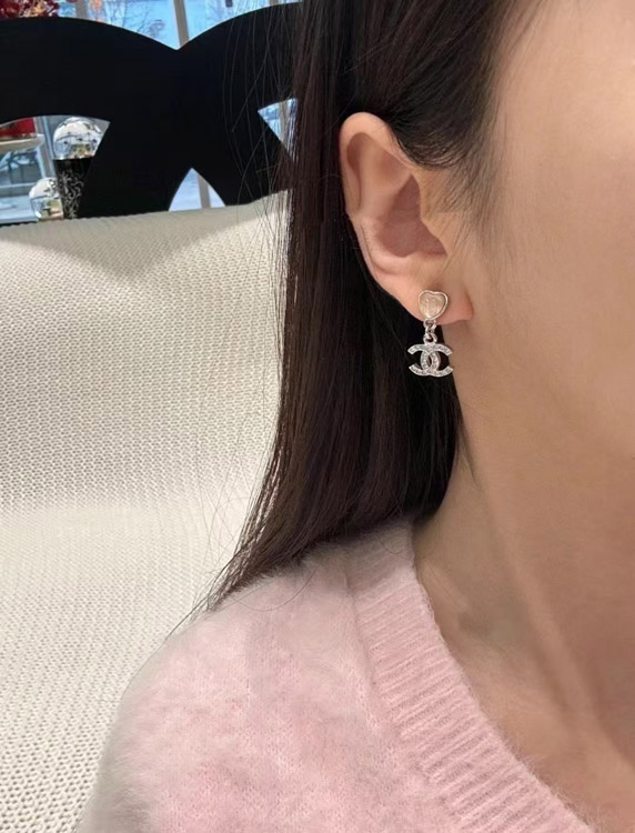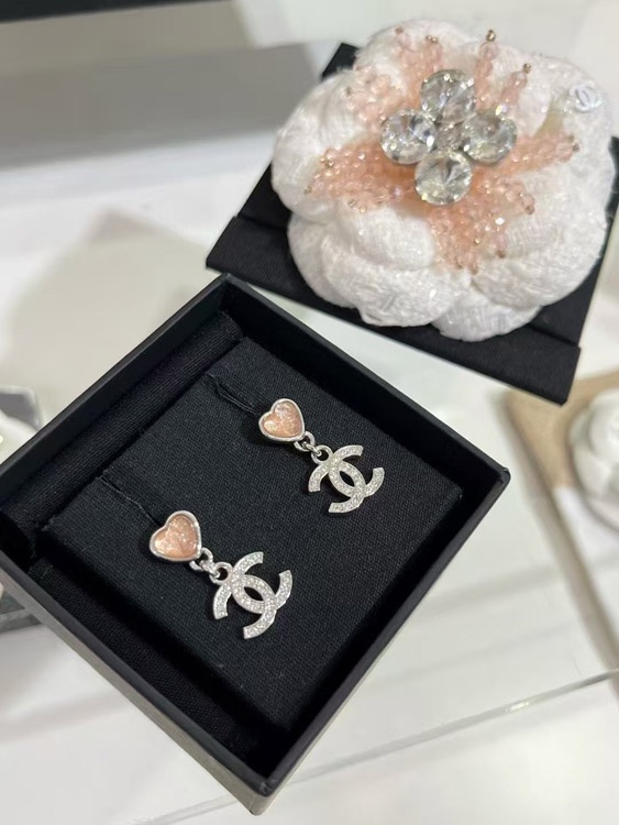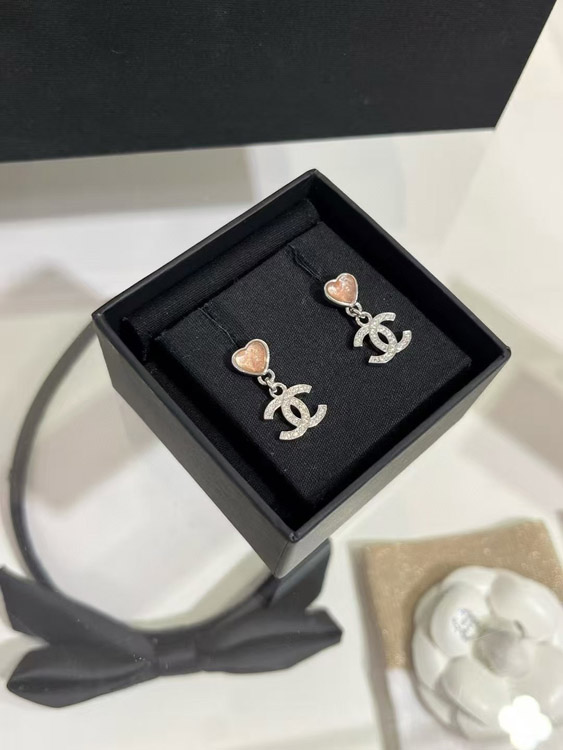 Chanel pink little heart silver full diamond double C earrings-3747