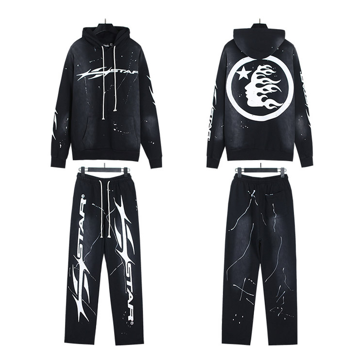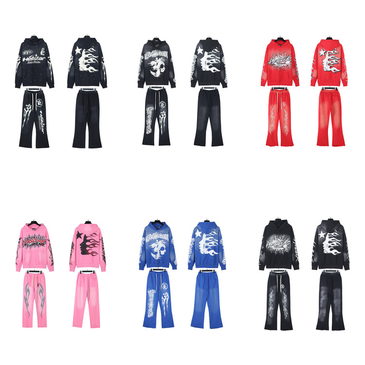Hellstar Letter Flame Hooded Long-Sleeve Sweatshirt and Sweatpants Set-4550
